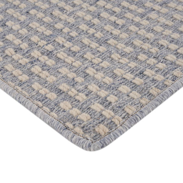 The Cycle Swatch serves as a material sample, providing a tangible representation of a larger textile product. This swatch is constructed from a blend of 70% wool and 30% polyester, combining the natural softness and resilience of wool with the enhanced durability and strength of polyester fibers. The design features a "Cavern" color base, characterized by a muted light blue-grey hue. This background is interspersed with a geometric pattern of raised, off-white squares, creating a subtle visual and tactile texture....