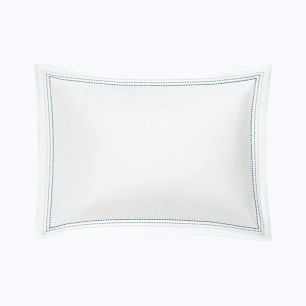 Bring quiet luxury to the bedroom with the Amara Triple Pearl Sateen Sham by Matouk. Crafted in lustrous cotton sateen with a 300 t.c., this refined sham features a trio of delicate embroidered strands in a tonal palette. An elevating addition to understated spaces. Choose from Hazy Pool, Palm Green, and Paradise. Available in Euro, King, and Standard.