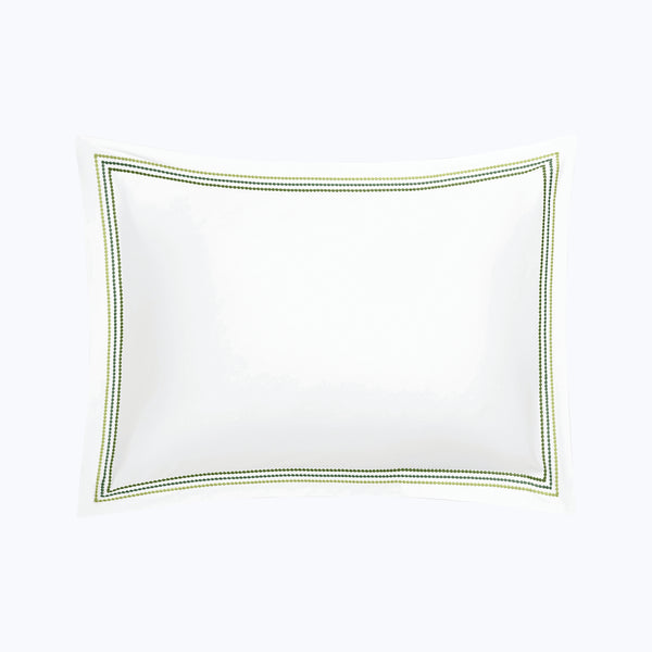 Bring quiet luxury to the bedroom with the Amara Triple Pearl Sateen Sham by Matouk. Crafted in lustrous cotton sateen with a 300 t.c., this refined sham features a trio of delicate embroidered strands in a tonal palette. An elevating addition to understated spaces. Choose from Hazy Pool, Palm Green, and Paradise. Available in Euro, King, and Standard.
