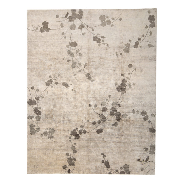 The Aurora Contemporary Tibetan Silk Rug combines traditional craftsmanship with modern design. This 8' x 10' rug is hand-knotted from 100% silk in Nepal, offering both luxury and durability. The rug features an Earth color palette, primarily a light, textured beige background. This subtle base is complemented by a flowing, nature-inspired pattern of slender branches and scattered blossom-like clusters in a deeper shade of brown-grey. The design provides visual depth and movement without dominating a space. The silk material gives...