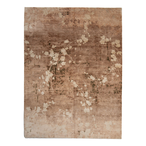 The Aurora Contemporary Tibetan Silk Rug combines traditional craftsmanship with modern design. This 8' x 10' rug is hand-knotted from 100% silk in Nepal, offering both luxury and durability. The rug features an Earth color palette, primarily a light, textured beige background. This subtle base is complemented by a flowing, nature-inspired pattern of slender branches and scattered blossom-like clusters in a deeper shade of brown-grey. The design provides visual depth and movement without dominating a space. The silk material gives...