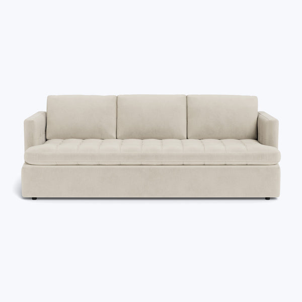 Sink into the lavish Boutique Queen Sleeper Sofa, an exclusive offering from abc carpet & home. This queen sleeper sofa effortlessly transforms from a clean-lined modern sofa to a full-size queen bed, making it the perfect solution for homes looking to host guests. The Boutique Queen Sleeper Sofa features a comfortable biscuit-tufted bench seat that unfolds into a spacious innerspring mattress, providing a restful night's sleep for your guests. The Boutique Collection showcases spring-down cushions made of soft foam and...