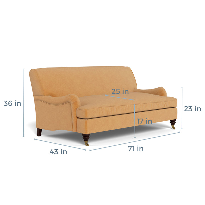 Exclusively available at ABC Carpet & Home, the Cambridge Apartment Sofa combines timeless charm with modern functionality. Featuring a vintage-inspired silhouette, this 71-inch sofa showcases refined, cushioned roll arms that exude classic elegance while offering deep seating and plush cushioning for an inviting and supportive lounging experience. Its castor legs add a distinctive touch, enhancing the sofa’s overall design with a nod to traditional style. Perfectly suited for compact living spaces, such as small living rooms or studio apartments, the Cambridge Sofa also serves as a sophisticated seating option at the foot of your bed, creating a cozy and stylish corner in any room.