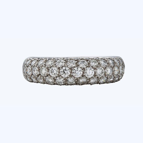 The Cartier Boule Ring showcases a stunning design with a multi-row pave setting of round-cut diamonds, set in 18K yellow gold. This contemporary piece is size 5.75 and weighs 2.10 ct. A luxurious statement ring that exudes elegance and quality.