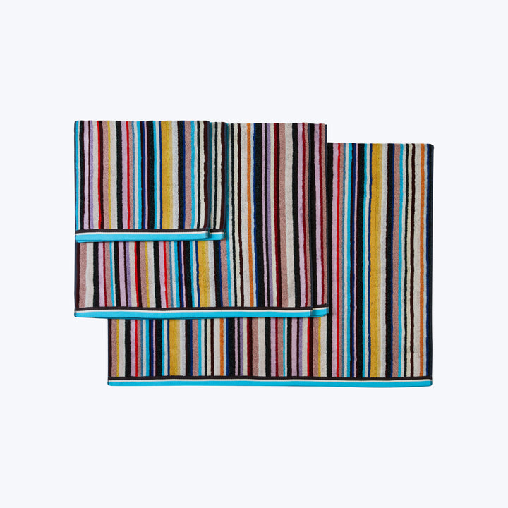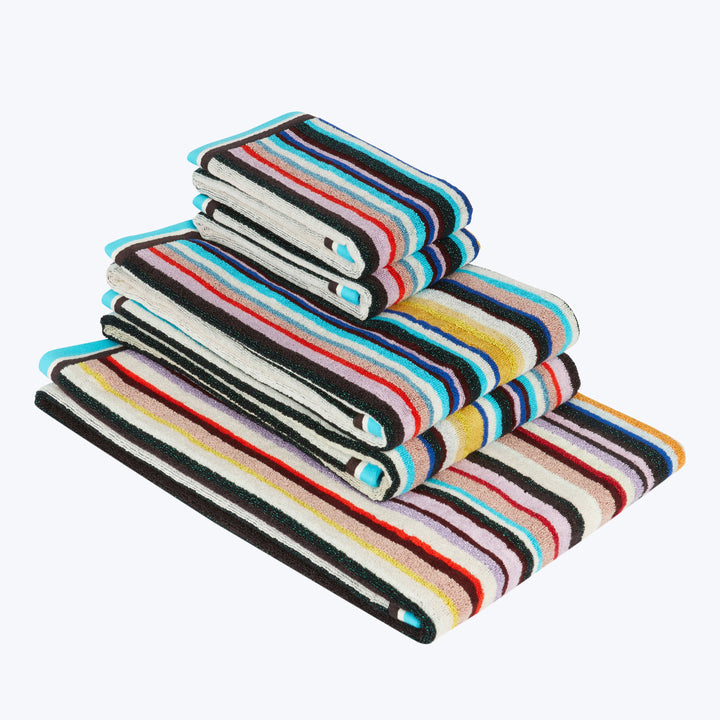 Turn your bathroom into an at-home spa oasis with this selection of Chandler Bath Towels from Missoni Home. Interwoven with a shiny metallic Lurex thread, these hand towels, bath towels, and bath sheets feature an intricate multicolored striped pattern that is sure to catch the eye with its modern style. The bath sheet's large size and fluffy soft velour allow it double as the perfect beach towel that's comfortable to lie on while the other terry side dries the skin in seconds. Missoni Home is a standout brand with a reputation for offering high-quality creations that are guaranteed to last for years to come.