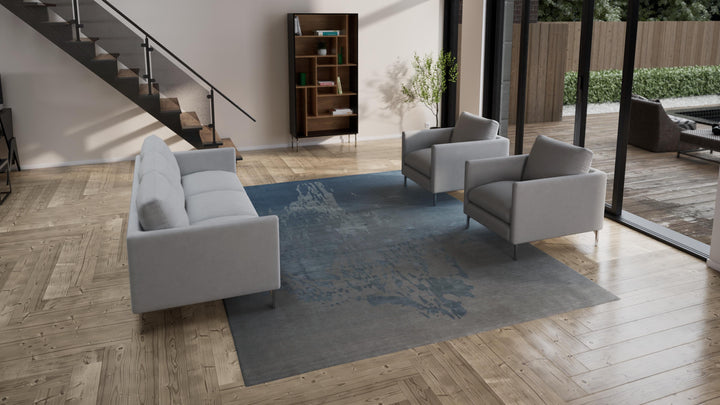 The rug features a distinct blue and grey color palette, which transitions from lighter grey-blue tones at the top to deeper blues towards the bottom. An organic, abstract design is integrated into the field, appearing like a faded or washed element. This visual texture adds depth to the rug without creating an overly busy pattern, offering a sophisticated focal point.