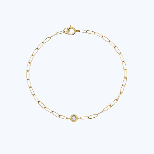A dazzling round gemstone is bezel set in 14k gold and linked together with a paper clip chain. Gemstone measures 3mm in diameter. Paperclip chain links measure 5.25mm x 1.75mm and fastens with a trigger clasp. From its inception, Anzie Jewelry has been a celebration of life and color. Named after its founder, Anzie Stein, this collection of fine jewelry is best known for its signature pieces using precious gemstones that bring luxury to your everyday wear.