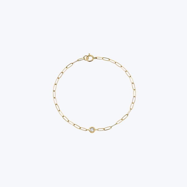 A dazzling round gemstone is bezel set in 14k gold and linked together with a paper clip chain. Gemstone measures 3mm in diameter. Paperclip chain links measure 5.25mm x 1.75mm and fastens with a trigger clasp. From its inception, Anzie Jewelry has been a celebration of life and color. Named after its founder, Anzie Stein, this collection of fine jewelry is best known for its signature pieces using precious gemstones that bring luxury to your everyday wear.