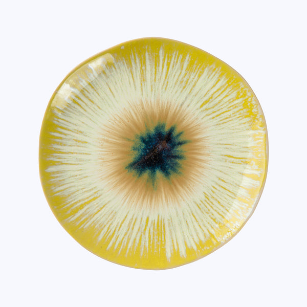 The Flora Dinner Plate is a stunning ceramic plate with a unique glaze pattern. It features a vibrant design resembling an abstract eye or colorful whirlpool. The deep blue center is surrounded by a ring of yellow that transitions into green hues that radiate towards the edges. The dynamic and organic effect is enhanced by a glossy finish. This 9" bowl from Thailand is made of high-quality ceramic that's lead and cadmium free. Experience the beauty and quality of this...