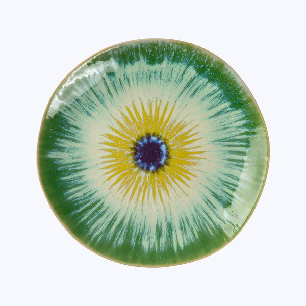 The Flora Dinner Plate is a stunning ceramic plate with a unique glaze pattern. It features a vibrant design resembling an abstract eye or colorful whirlpool. The deep blue center is surrounded by a ring of yellow that transitions into green hues that radiate towards the edges. The dynamic and organic effect is enhanced by a glossy finish. This 9" bowl from Thailand is made of high-quality ceramic that's lead and cadmium free. Experience the beauty and quality of this...