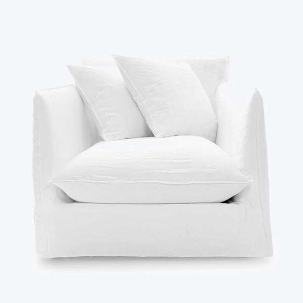 Sink into the divine embrace of the Ghost Slipcover Lounge Chair from Gervasoni. Featuring a tall, sturdy wooden frame padded with soft polyurethane foam, this chair offers significant comfort and support. The loose cushions, filled with luxurious mixed down, invite you to sink into new levels of relaxation. This chair's clean, defined shape is accentuated by an oversized removable slipcover, made from a luxurious blend of cotton and pre-washed linen. Visible stitching outlines the slipcover's shape, allowing for easy removal...