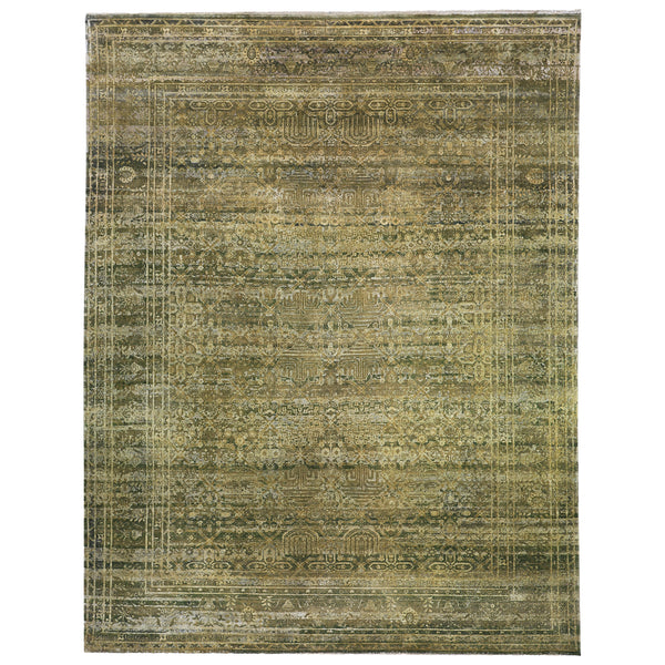 This Brown Alchemy Traditional Silk Wool Blend Rug is a stunning 9'2" x 12'1" masterpiece from India. Hand knotted with exquisite detail, it features a green color palette with textured shades and ornate symmetrical patterns. The intricate design exudes elegance and antiquity, framed by a border of geometric motifs. Crafted with high-quality materials, this rug is a luxurious addition to any space.