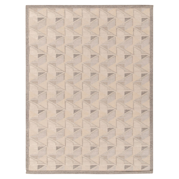 This Grey Swedish Inspired Flatweave Wool rug from India features a geometric pattern of interlocking triangles and trapezoidal shapes in shades of beige, cream, and light grey. Hand-woven from 100% wool, this high-quality rug has a textured appearance and a modern aesthetic that will enhance any interior setting.