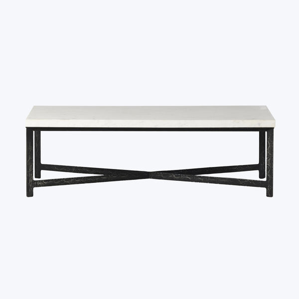 Minimalist refinement meets industrial elegance in the Hammered Iron Coffee Table by Four Hands. This elegant coffee table features a rectangular marble tabletop supported by an open, hand-hammered black iron base. The result is a beautifully streamlined look with a hint of rustic character.
