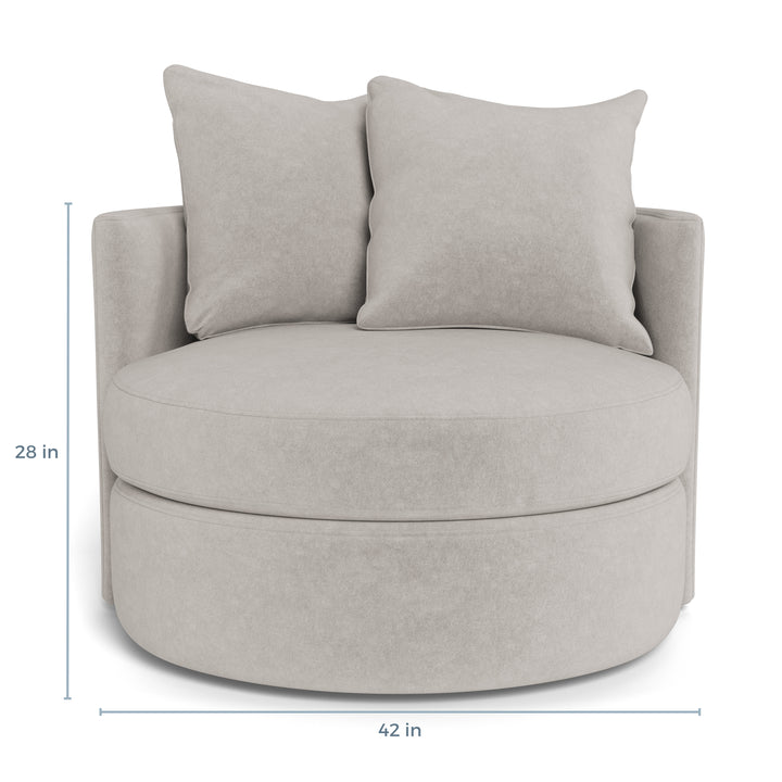 The chair comes with two generously filled back pillows, packed with feather and down for that soft, sink-into-me feeling. These pillows provide exceptional support, making the chair a truly snuggle-worthy option for moments of relaxation. Whether you’re curled up with a good book, chatting with friends, or just enjoying a quiet moment, the Hollywood Swivel Chair offers the kind of loungy, cozy seating that makes you want to stay awhile.