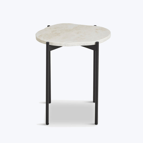The La Terra Occasional Table, designed by Agnes Morguet, is a harmonious and sophisticated addition to your home. Inspired by nature, this travertine side table features a natural design that beautifully embraces the organic shapes and muted colors of soft pebbles in the landscape. The infinite variants of the natural stones are reflected in the tabletop's smooth, floating shape which contrasts the sleek crossing black metal frame.