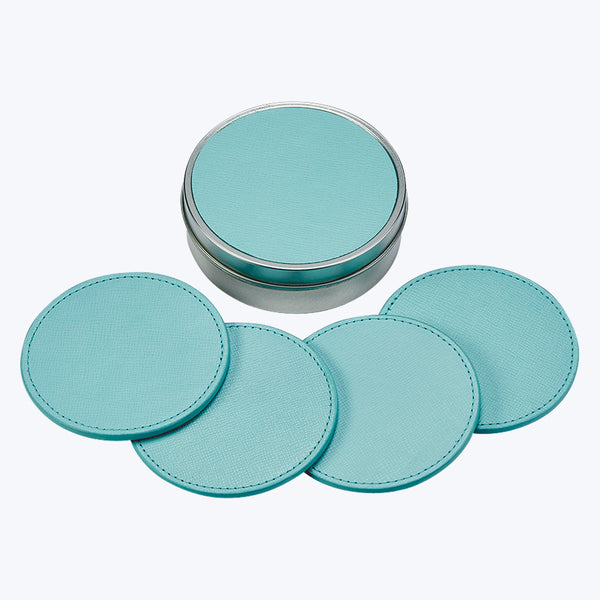 The Leather Coasters with Tin Box by Graphic Image make a great hostess gift or addition to your own decor collection. Designed with non-skid bottoms to keep drinks in place and furniture safe, these handmade leather coasters come in a retro, custom-sized tin. Available in Black, British Tan, Red, and Robin's Egg Blue.