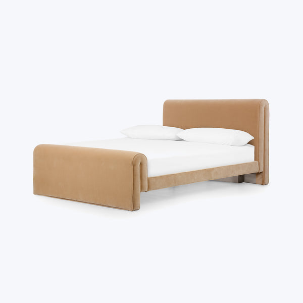 The Four Hands Mitchell Bed combines luxury and contemporary style with a chic-shaped frame upholstered in a rich Surrey Camel cotton-blend fabric. Available in king and queen sizes, this bed brings a warm, inviting touch to your bedroom or guest room. The camel-colored upholstery offers a versatile, neutral tone that easily complements a variety of decor styles and palettes.Crafted with a durable manufactured wood frame, this bed doesnÕt require a box spring, adding a sleek, low-profile look. The performance fabric...