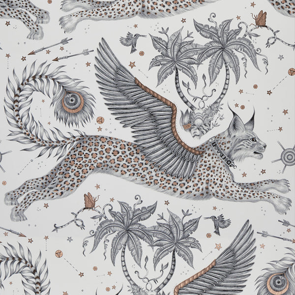 Made in partnership with interior design experts Clarke & Clarke, the Lynx Wallpaper features an intricately hand-drawn magical winged lynx leaping through a starry night sky, inspired by South African paintings and mythology. Lose yourself in the imaginative details and neutral base options and colorful focal points with metallic touches. This magical traditional wallpaper is part of the magical Wilderie Collection by British graphic designer Emma J Shipley, specializing in home wallpaper for nature lovers, dreamers, and maximalists that are...