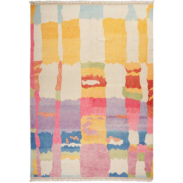In the heart of a living space, this 9' x 12' multicolored Moroccan wool rug commands attention with an enthralling abstract design that blurs the line between traditional and modern aesthetics. Hand-knotted in Turkey, it speaks to a rich heritage of craftsmanship while seamlessly dovetailing with contemporary sensibilities. An off-white backdrop sets the stage for a vibrant cascade of color. Bold vertical bands in hues of yellow, fuchsia, lilac, and an array of blues and greens draw the eye, each...