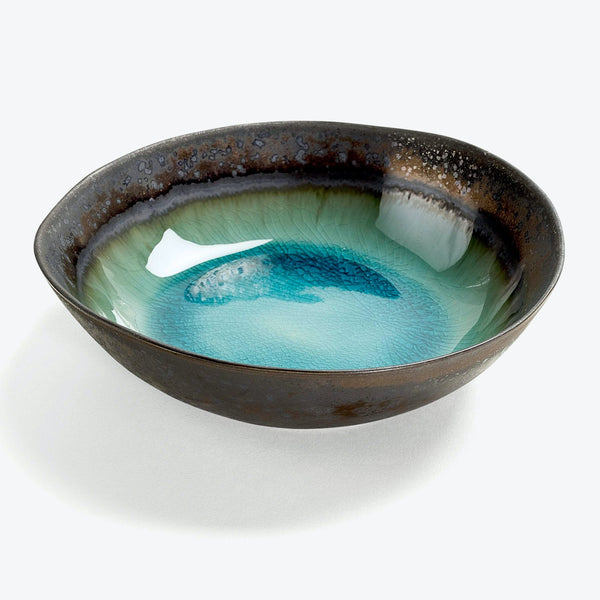 Fusing Eastern and Western styles, philosophies, and techniques, stoneware ceramics are crafted in Thailand. Cool tones brilliantly crackle in a marine habitat - a play of shadows, light, and texture. Each piece features one-of-a-kind crystalized designs inspired by pools of water.