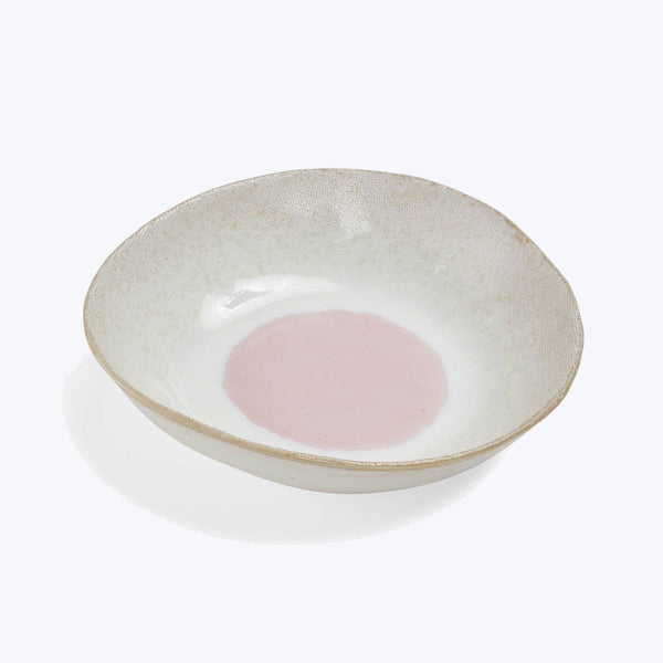 Fusing Eastern and Western styles, philosophies, and techniques, stoneware ceramics are crafted in Thailand. Warm desert hues fade outward from the center, playing with light and shadows to evoke an air of mysticism.