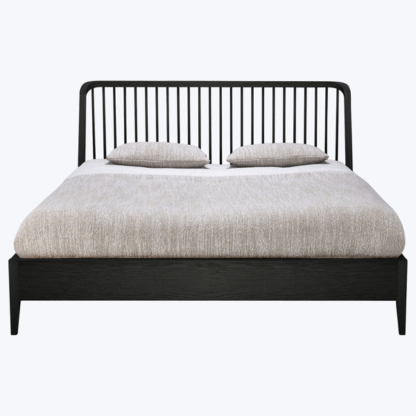 Inspired by the traditional spinning wheel, the Ethnicraft Oak Spindle Bed brings timeless craftsmanship and a gentle elegance to your bedroom. Crafted from solid oak, this bed combines strength with warmth, ensuring durability while maintaining an inviting aesthetic. Available in queen and king sizes, this bed’s unique blend of traditional inspiration and modern design will elevate any bedroom. The headboard features a stunning arrangement of perfectly aligned spokes, a tribute to the art of spinning, while the tapered legs and...
