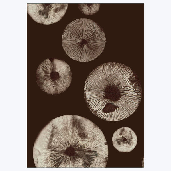 Discover “Mushroom - 5 Chocolate” by Pernille Folcarelli. Featuring an arrangement of various sized mushrooms, this captivating work showcases the woodland staple’s intricate gill patterns and unique textures. The monochromatic palette and dark background enhance the natural beauty and mystery of these fungi, inviting viewers to explore their mesmerizing structures. A striking piece, perfect for moody and avant-garde interiors. Unframed. Available in three sizes.