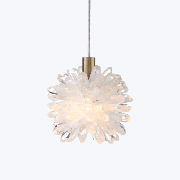The petite Purity Pendant is a burst of brightness with each of its spikes made of natural quartz. The crystal is very reflective so it creates a nice glow when illumination strikes it. The white pendant takes on another aspect of this natural material, as the textural quality of the crystal creates a more dynamic profile. It hangs from a slender cord to keep the design simple.