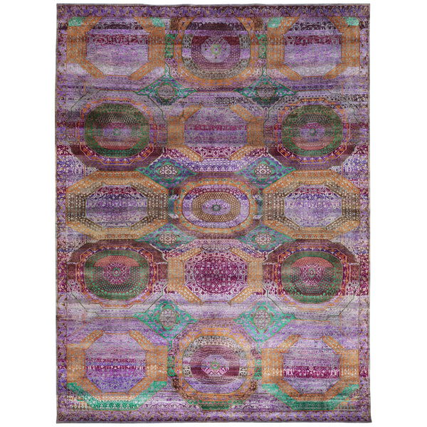 The Purple Alchemy Traditional Silk Rug, measuring 9 feet by 12 feet, is a distinguished piece from the Alchemy Rug Collection. This area rug is hand-knotted in India, showcasing traditional craftsmanship. It features a predominantly purple color scheme, enriched with a multi-tonal palette that includes shades of green, teal, gold, and rust, creating a complex visual texture. The design of the rug incorporates a series of overlapping and interlocking geometric patterns. Prominent octagonal and oval medallions are arranged throughout the...
