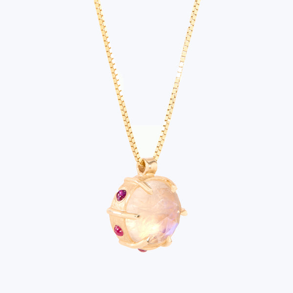 The ROYAL MILE Moonstone and Ruby Pendant Necklace centers on a luminous rose-cut rainbow moonstone, prong-set to highlight the stone’s soft glow and shifting iridescence. Surrounding the moonstone, flush-set purple rubies add delicate points of color, creating a subtle yet striking contrast against the warmth of the gold. Suspended from a fine gold chain, the pendant is finished with a custom-designed S-hook clasp accented with a small diamond for an extra touch of refinement. The ROYAL MILE Moonstone and Ruby...