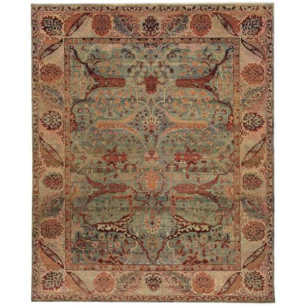 This hand-knotted wool rug from the Alchemy Rug Collection blends traditional motifs with a modern aesthetic, creating a transitional design suitable for various interiors. Measuring 7'11" x 9'10", this large area rug is crafted for both visual appeal and durability. The design showcases a complex color palette, with a predominant ground of muted teal and blue-green hues. This is artfully balanced by significant use of rust, terracotta, and warm earthy tones that define the intricate floral and vine patterns. Stylized...