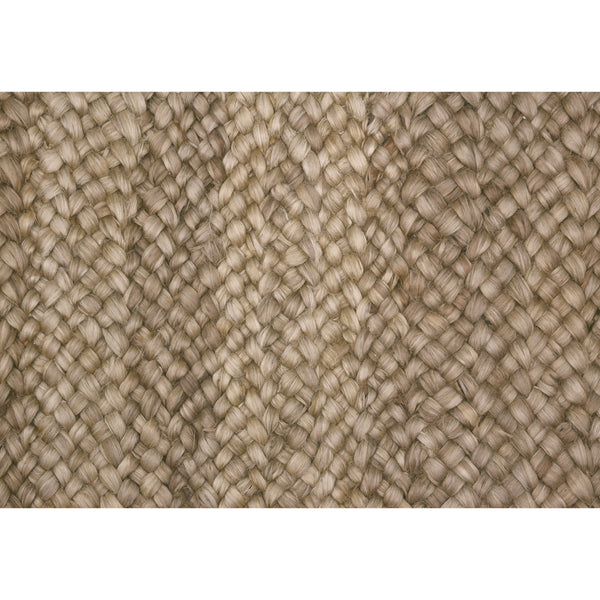 This Selva Swatch is a 6" x 6" hand-loomed swatch from India, made of 100% jute. The herringbone pattern in various shades creates a rustic and textured appearance, typical of high-quality woven rugs. Perfect for adding a touch of natural beauty to your home décor.