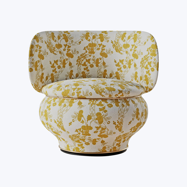 Introducing the Dulcis Swivel Chair, the newest member of the playful and elegant Dulcis Poufs family from Ginori 1735. Inspired by the rounded edges of historic Ginori 1735 favors, this designer chair boasts a curved shape and ergonomic design that effortlessly complements dining tables and lounge settings alike. Equipped with a spherical system, it swivels seamlessly to provide maximum comfort and flexibility. The soul of this luxury chair lies in its transformative textiles, upholstered in both Oriente Italiano and Ondori...