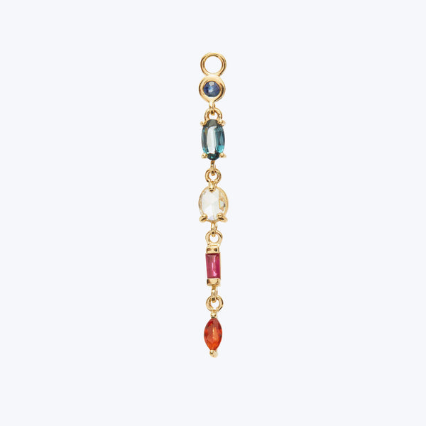 Meet the Rokia Blue Chain Drop Charm! Cast from solid 14k yellow gold with a striking array of colorful gemstones, this drop jewelry charm includes blue sapphire, blue topaz, bright orange garnet, red ruby, and brilliant rose-cut diamonds. All Schosha Charms are designed to fit any classic huggies hoops or easily added to your favorite charm bracelet or necklace chain with a charm enhancer, each sold separately. Scosha Jewelry is a colorful, creative combustion of art meets artifact with a...