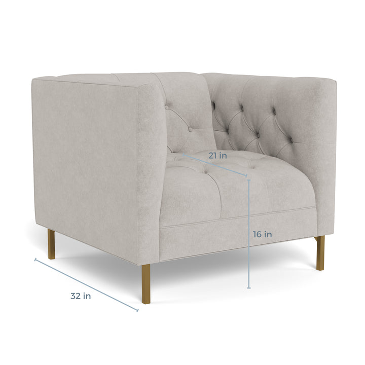 Measuring 34 inches in width, 30 inches in height, and 32 inches in depth, with a seat height of 16 inches and a seat depth of 21 inches, the Tribeca Chair offers a comfortable and inviting space for relaxation. With a back and arm height of 30 inches, it provides optimal support for lounging. Additionally, choose between brass and silver leg finishes to perfectly match your interior style.