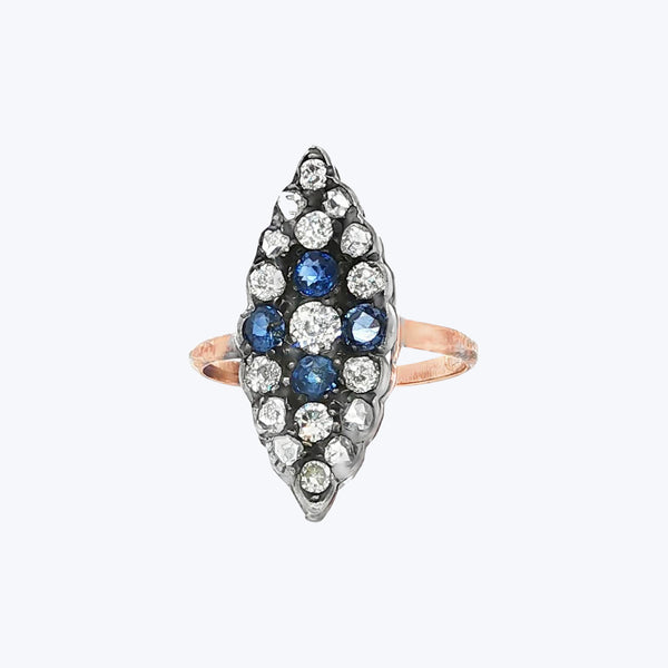 Add old-world elegance to your look with the Victorian Marquise Diamond and Sapphire Ring by abcVintage. This stunning Victorian ring captures the era’s romance with elongated form and celestial contrast. Set in silver over gold, its surface shimmers with approximately 0.78 carats of old-cut diamonds interspersed with 0.27 carats of deep blue sapphires. The ring’s tapering silhouette elongates the finger with quiet drama, while the interplay of light and shadow evokes the mystery of a bygone age. An heirloom piece—meant...