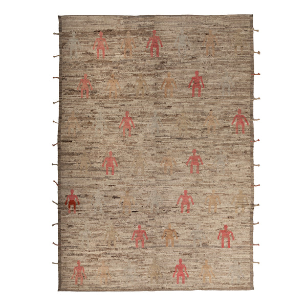 This Zameen transitional wool rug offers a blend of traditional craftsmanship and adaptable design. Measuring 6'9" x 9'7", it provides substantial area coverage suitable for various room settings. The rug features a textured field in varied brown and cream tones. Across this base, distinctive human-like figures are arranged, primarily in a reddish-pink hue, with some appearing in softer, muted shades. This abstract figural pattern creates a unique visual element. The transitional style allows this rug to complement both classic and...